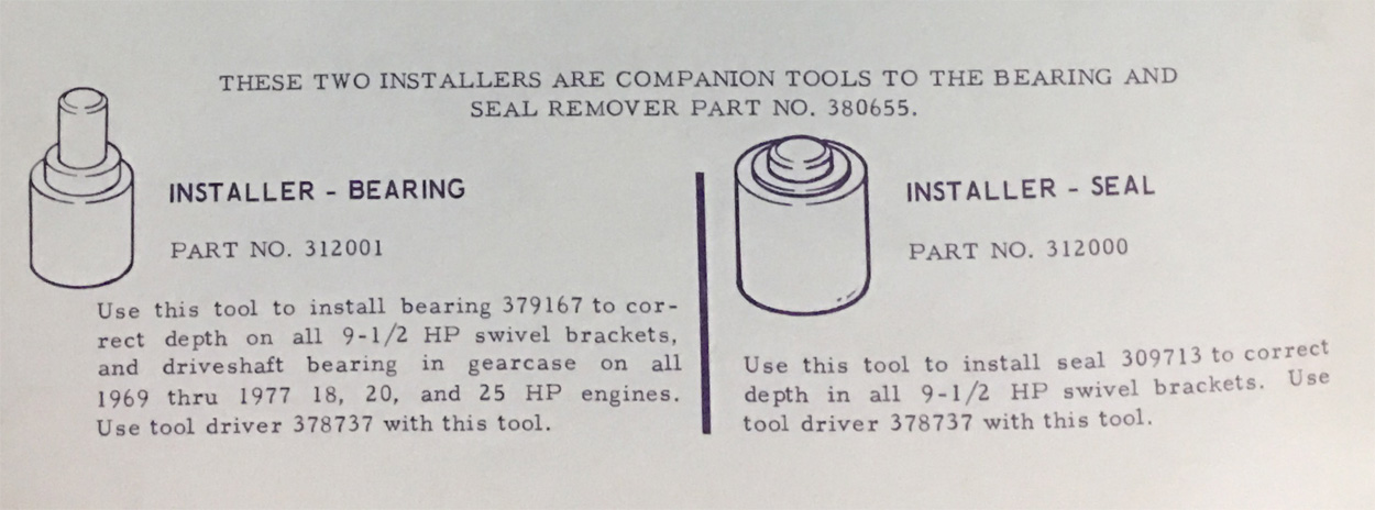 THESE TWO INSTALLERS ARE COMPANION TOOLS TO THE BEARING AND SEAL REMOVER INSTALLER - BEARING Use this tool to install bearing 379167 to correct depth on all 9-1/2 HP swivel brackets, INSTALLER - SEAL Use this tool to install seal 309713 to correct depth in all 9-1/2 HP swivel brackets.