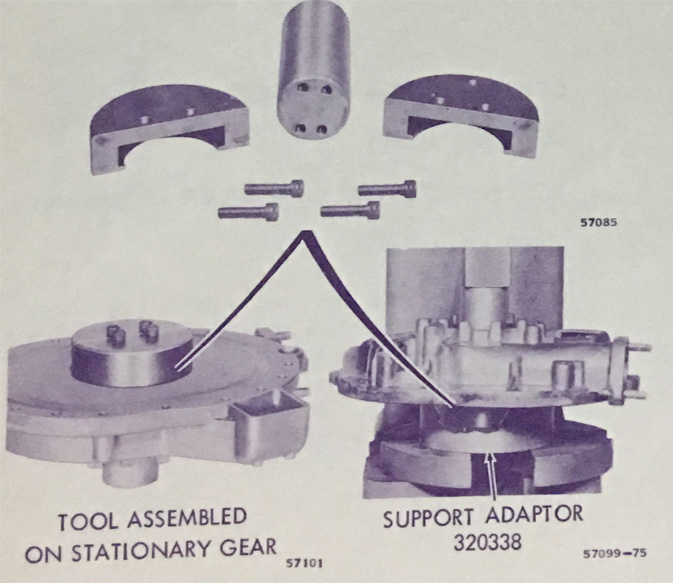 REMOVER & INSTALLER - STATIONARY GEAR For 1973-76 R.C. engines. Use this tool with the support adaptor 320338 and an arbor press to remove or install the stationary gear on the flywheel end housing. Using this tool eliminates the possibility of damage to the stationary gear or the end housing. Includes the following components which are available separately: