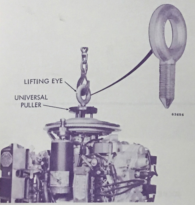 321537 Lifting Eye For all models that need a straight lift from the crankshaft centerline. LIFTING EYE For engines that did not come equipped with a lifting bracket. To lift these, use the lifting eye with your universal puller 378103. This lilting eye places the lift point directly above the crankshaft center line making it easy to remove or install the engine on the typical boat transom.
