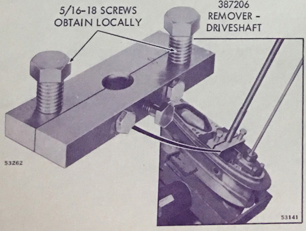 Driveshaft Puller REMOVER - DRIVESHAFT For 1975-77 50 and 55 HP; 1975-77 75 HP (short shaft). The upper driveshaft bearing cup is a press fit in the gearcase so removing the driveshaft can be difficult without this tool. Tool is assembled around the driveshaft at the keyway. Once located, thread the locking screw into the keyway. With two 5/16-18 screws installed through the plates and two metal pads under the screws, turn the screws alternately and evenly until the bearing cup "pops" out of the gearcase.