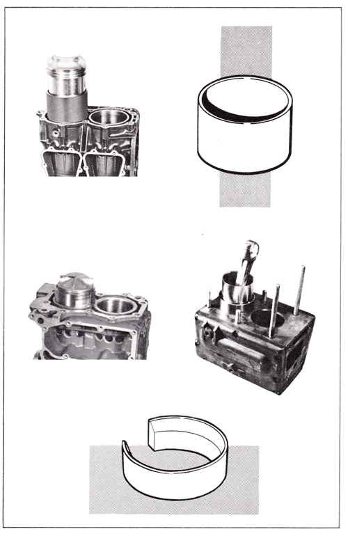 PART NO. 552482 Oil piston and rings thoroughly. Slip piston ring compressor over piston skirt with taper facing rings. Place piston assembly in cylinder and carefully work rings into compressor making sure rings are aligned with the dowel pin. Press piston into cylinder. Do not hammer. |