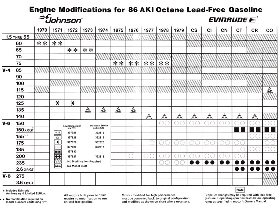 Johnson and Evinrude models will operate, or may be modified to operate, on unleaded gasoline. Included in this bulletin is a scaled down outboard portion of Wall Chart CR85-54. The chart lists the models requiring modification, the modification kit part numbers, and part numbers of individual, low compression, cylinder head gaskets.