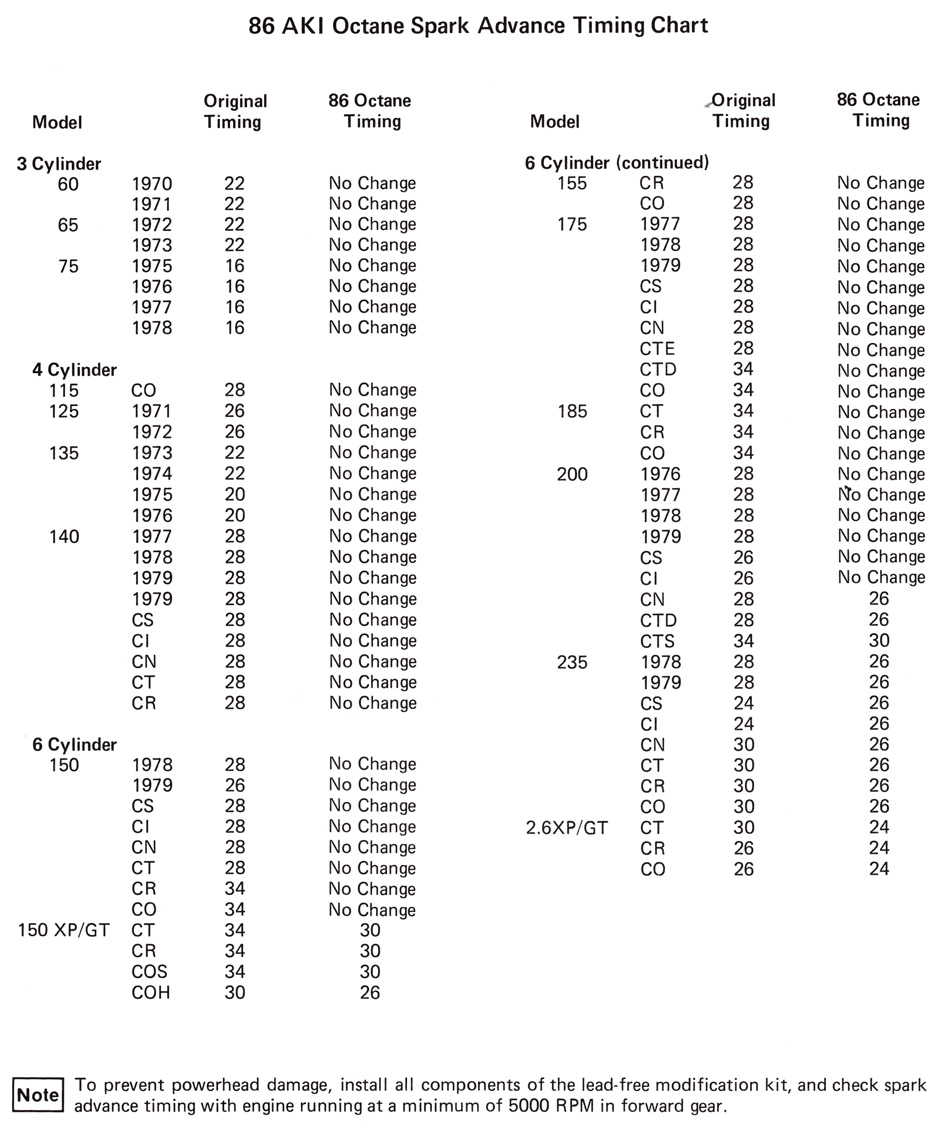 In most cases, there will be a slight power loss after the engine has been modified to operate on 86 AKI gasoline. If necessary to maintain good acceleration onto plane, reprop the motor to run in the upper end of the full throttle operating range.