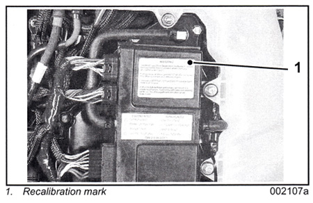 | Identification Procedure Every outboard that has had recalibrated software successfully installed must be easily identified. Use a BLACK permanent marker to mark the EMM as shown below to indicate this recalibration software has been installed.