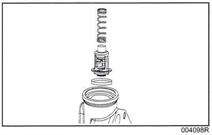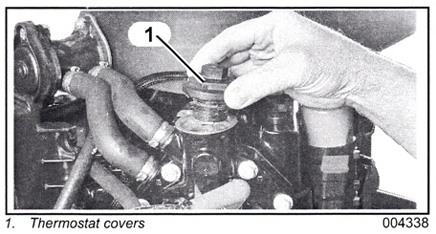 Remove the paper towel from the cylinder head. Clear any chips or debris from area using compressed air, and reinstall the original thermostat assembly and thermostat spring. Inspect thermostat O-ring. Replace, if necessary. Carefully coat threads of each head thermostat cover with Gasket Sealing Compound. Install and and tighten the cover to a torque of 120 to 144 in. lbs. (13.6 to 16.3 N-m). IMPORTANT: Use caution when coating thermostat cover threads to endure air bleed holes are not coated or obstructed.