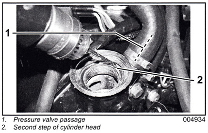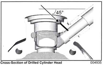 IMPORTANT: Carefully place a paper towel or equivalent in cylinder head opening to prevent metal chips from entering the cooling passages of cylinder head. IMPORTANT: Apply grease to the full length of drill bit to capture metal chips during drilling. Use a 1/8 in. drill bit. Center drill bit on pressure valve passage. Drill a 1/8 in. (0.3 mm) hole at a 45° angle into the second step of the cylinder head.
