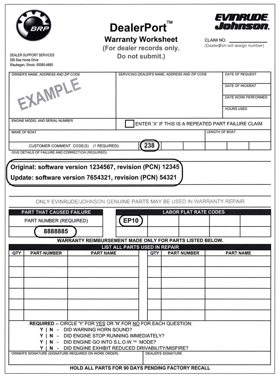 IMPORTANT: Do not use failing part number 8888885 if the EMM software update is being performed as a result of a specific warranty bulletin. Refer to the applicable warranty bulletin for unique failing part numbers related to specific warranty campaigns. North American Dealers - Warranty allowance requests should be submitted "online" using the DealerPort website. Complete DealerPort Warranty Worksheet and keep at dealership with outboard's service records for future reference. Worksheet can be downloaded from DealerPort website. See engines/Evinrude/Forms. Refer to example of DealerPort Warranty Worksheet on back of this bulletin. |